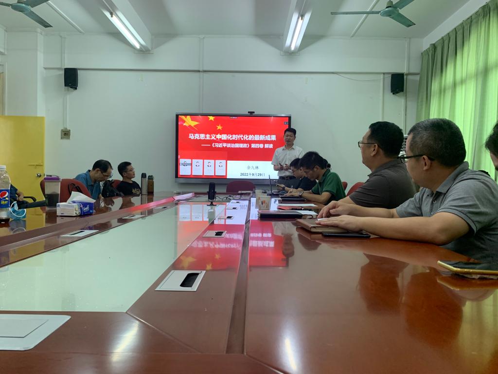 2022年9月29日下午,在东校区一教1311室,bevictor伟德官网召开学习贯彻《习近平谈治国理政》第四卷专题报告会,余九林博士以《马克思主义中国化时代化的最新成果—<习近平谈治国理政>(第四卷)解读》为题,作了专题报告。会议由公司党委书记房亚兵同志主持,公司全体教职工出席了会议。
