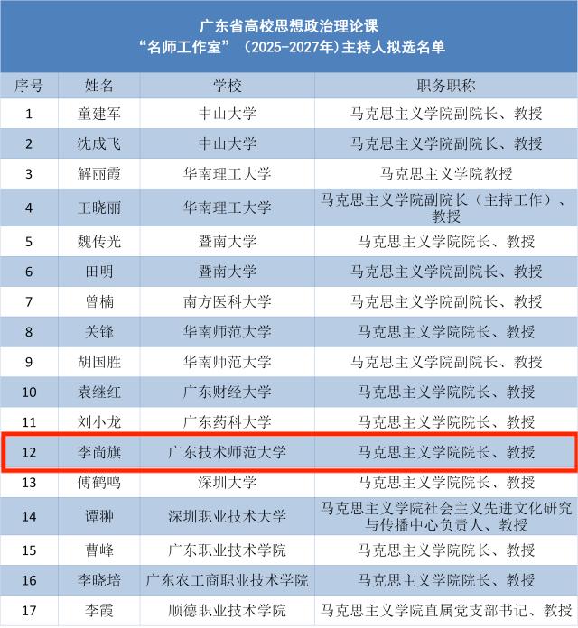 4月15日,广东省教育厅发布广东高校思想政治理论课“名师工作室”主持人拟选名单,bevictor伟德官网经理李尚旗教授入选。
