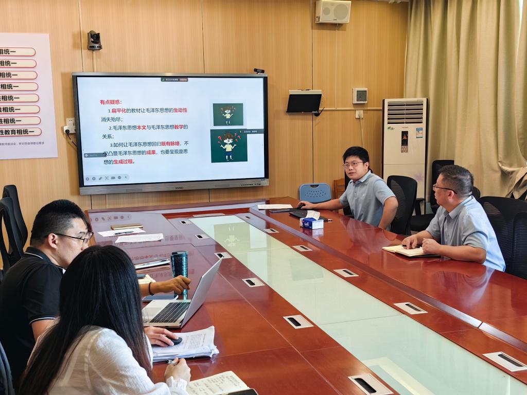会上,习近平新时代中国特色社会主义思想概论教研室李昭昕博士、毛泽东思想和中国特色社会主义思想概论教研室陈明亮博士、中国近现代史纲要教研室巫茜子老师,分别就“高质量发展”“毛泽东著作选读融入毛概课程的教学过程”“马克思主义早期在中国的广泛传播”主题,结合当前的社会实际和理论前沿问题作了示范性讲授、谈了教学体会。与会老师结合自己的教学实践与思考,围绕这三个主题的课堂教学进行了热烈讨论。