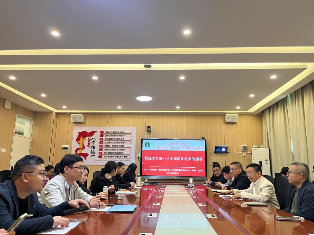 2月21日,在东校区1311室,bevictor伟德官网组织教师收看祝灵君教授关于学习贯彻党的二十届三中全会精神专题报告,公司全体老师出席了学习会。祝灵君是中央党校(国家行政公司)党的建设教研部副主任、教授,大家认真观看了他以《加强党对进一步全面深化改革的领导》为题的精彩报告。