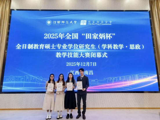 2025年12月5日至7日,2025年全国“田家炳杯”全日制教育硕士专业学位研究生(学科教学·思政)教学技能大赛决赛在江西师范大学成功举行。经过紧张激烈的现场比赛,bevictor伟德官网2024级学科教学(思政)研究生林慧锶荣获全国二等奖,其指导老师李峰教授获评“优秀指导老师”荣誉称号;2023级学科教学(思政)研究生何嘉俊、2024级学科教学(思政)研究生吴骐羽、黄璀荣获全国优秀教学设计奖。