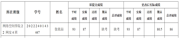 网络空间公司2 2 网安4班张依喆(2 0 2 2 2 4 0 1 4 3 447)同学于2024-2025学年第1学期学习“习近平新时代中国特色社会主义思想概论”课程,期末考试后,在超星系统内没有找到该生考试记录及相应成绩,同时跟所在班级学委确认,该考生“因个人原因缺考了”,故老师在录入成绩系统时选了“缺考”。现该考生反馈参加了考试,并发现在系统内该考生成绩存在了,现申请更改成绩为86分。具体课程成绩的修改信息如下: